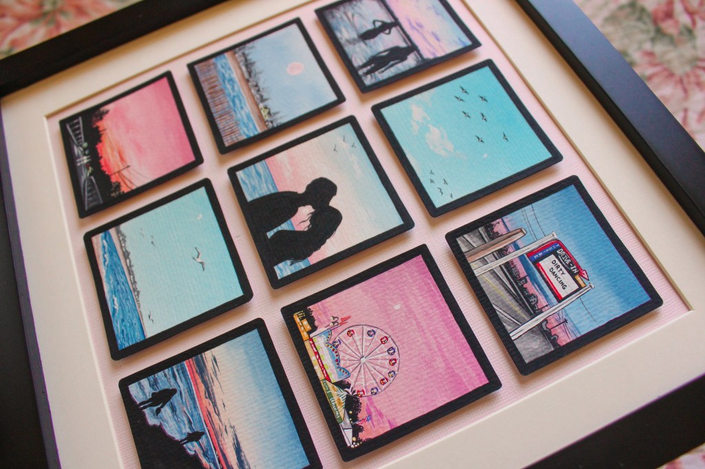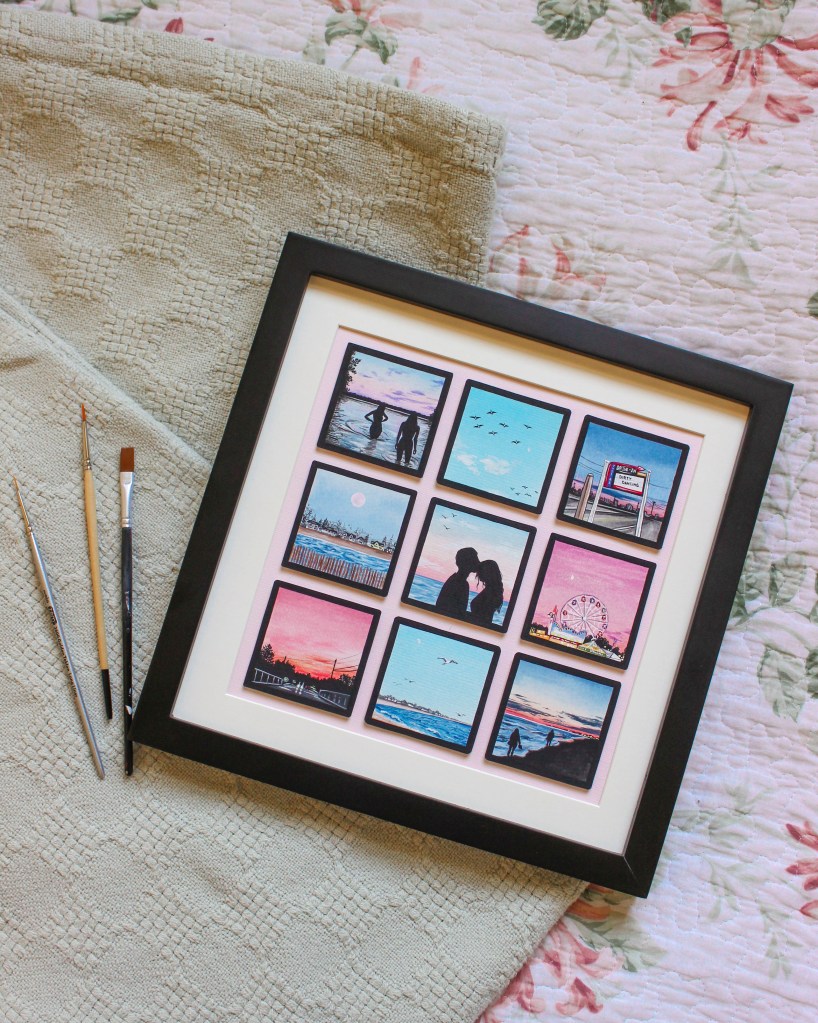I gave one to Mom for her birthday (blue), and I kept the other for myself (pink). In my collage, the only square not painted directly from a photo that I took was the one in the center of my frame: the couple in the pink sunset.