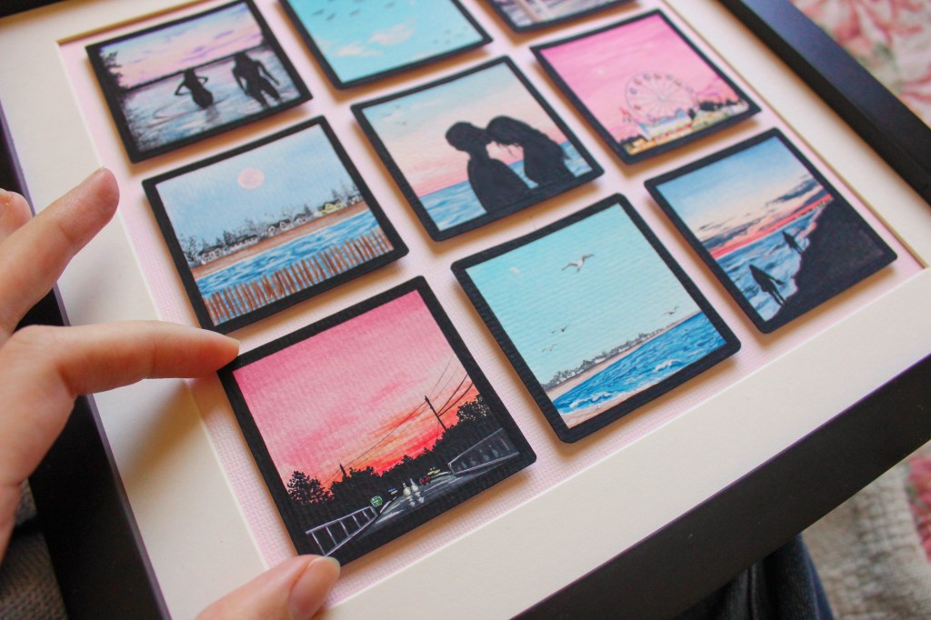 Earlier in the year I started making these tiny mini portraits. I got obsessed with them, and was working on them night and day. They were all 2”x2” acrylic paintings, many of them based off photographs that I’d taken. I made some into notecards, and then started collecting them for these little gallery art pieces that I could envision in my head.