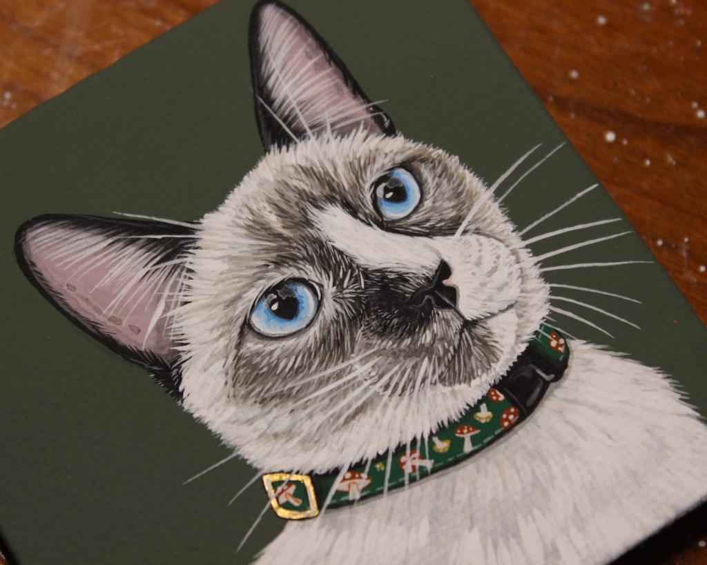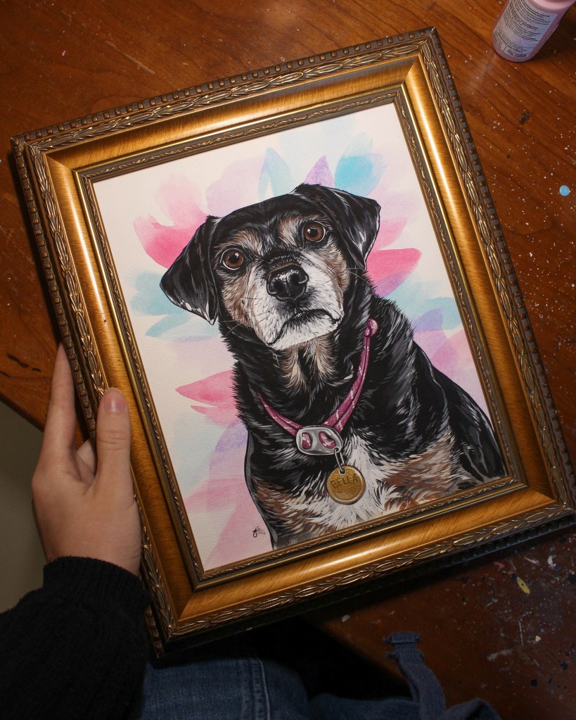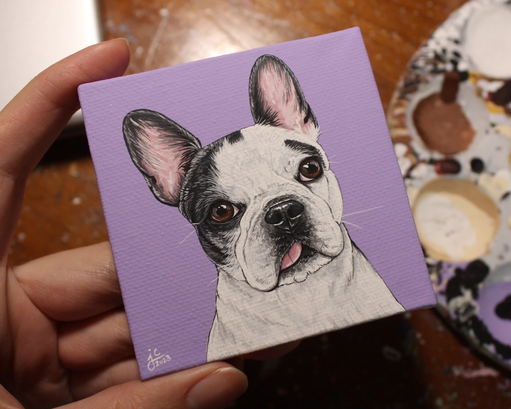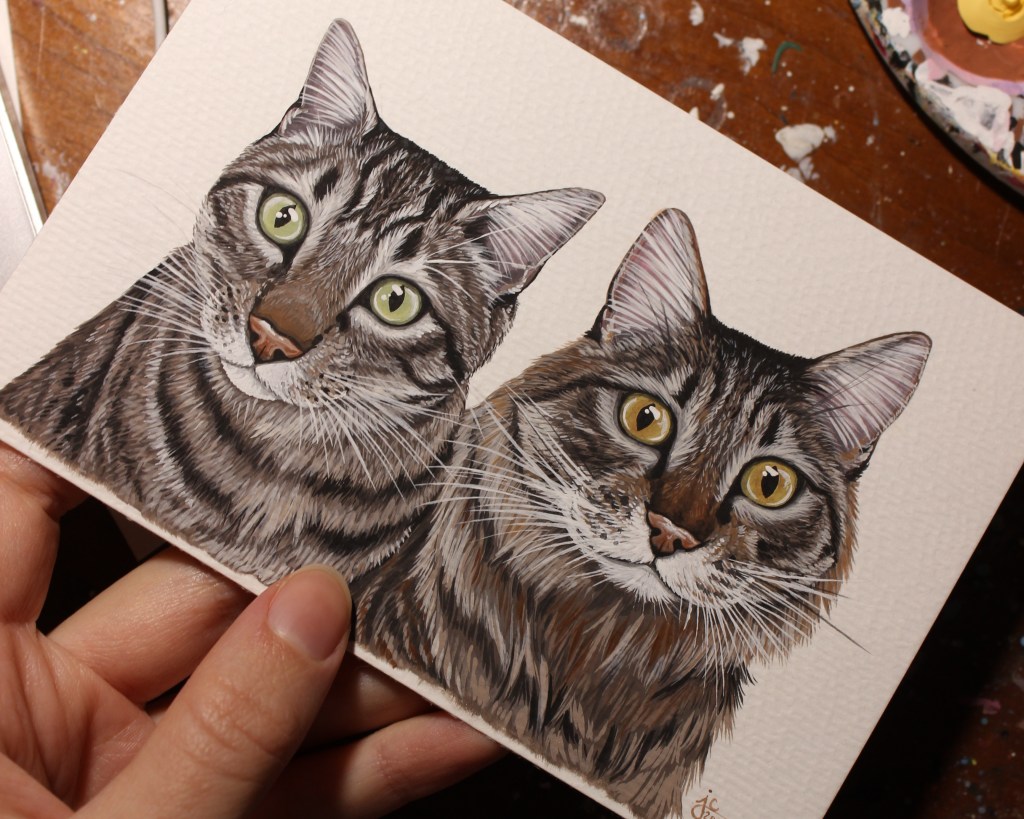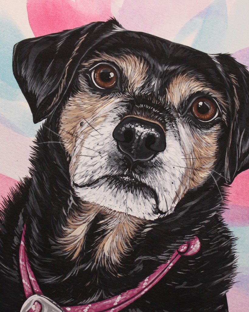 I seem to have gotten into a pretty good work flow recently painting my pet portraits. I’m able to sit down and either finish one portrait per day (if they’re a small size), or one portrait every other day (if they’re a bigger size, or a double portrait).