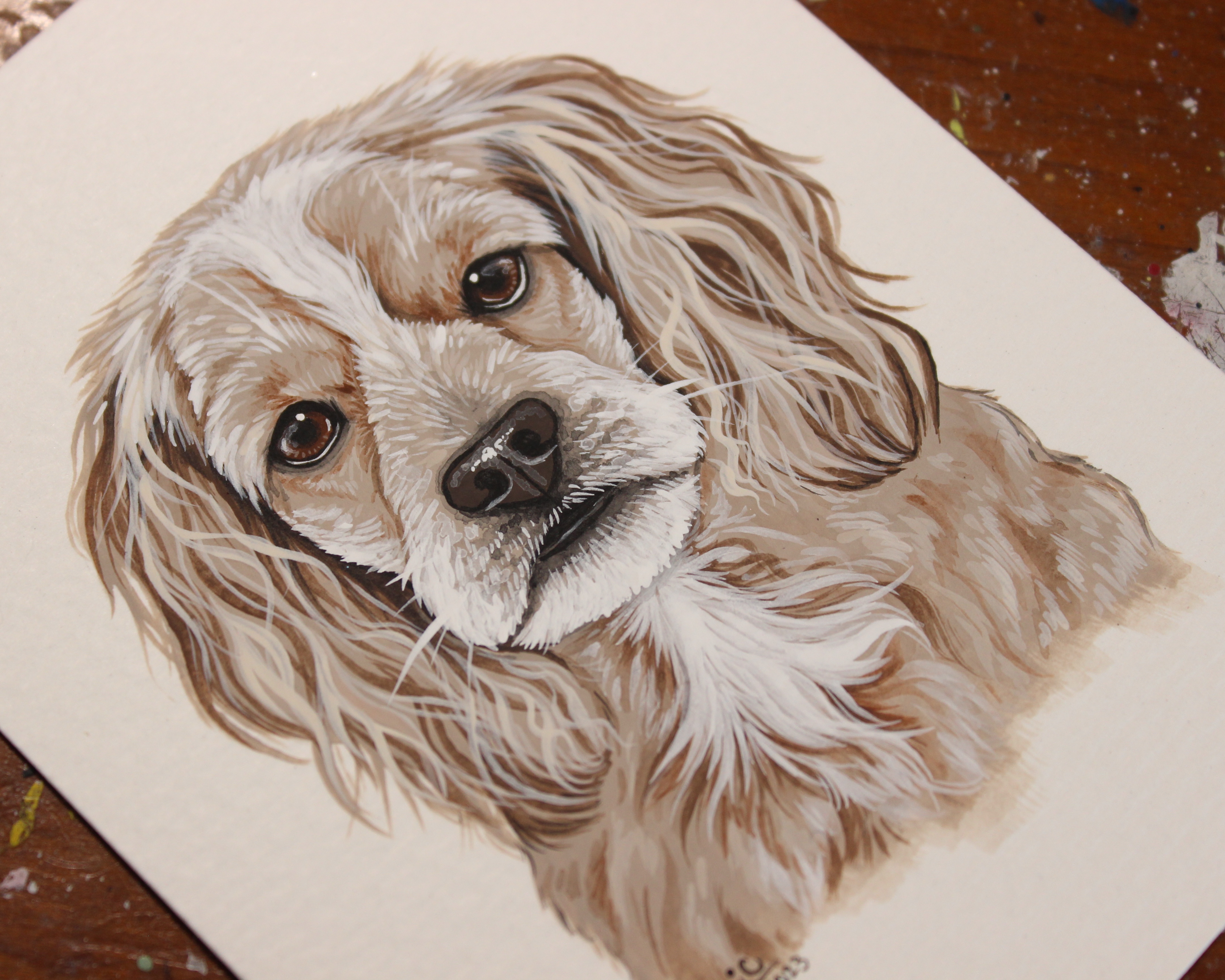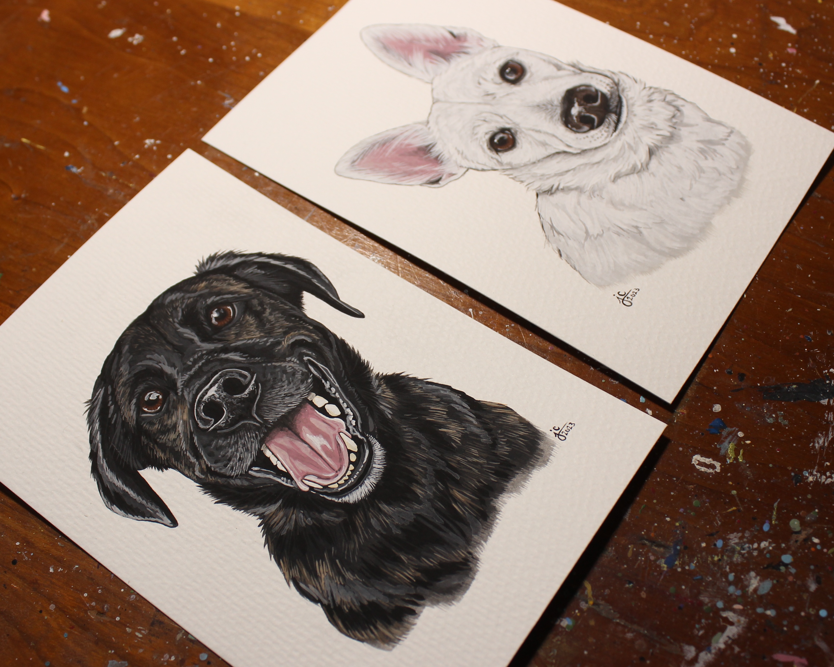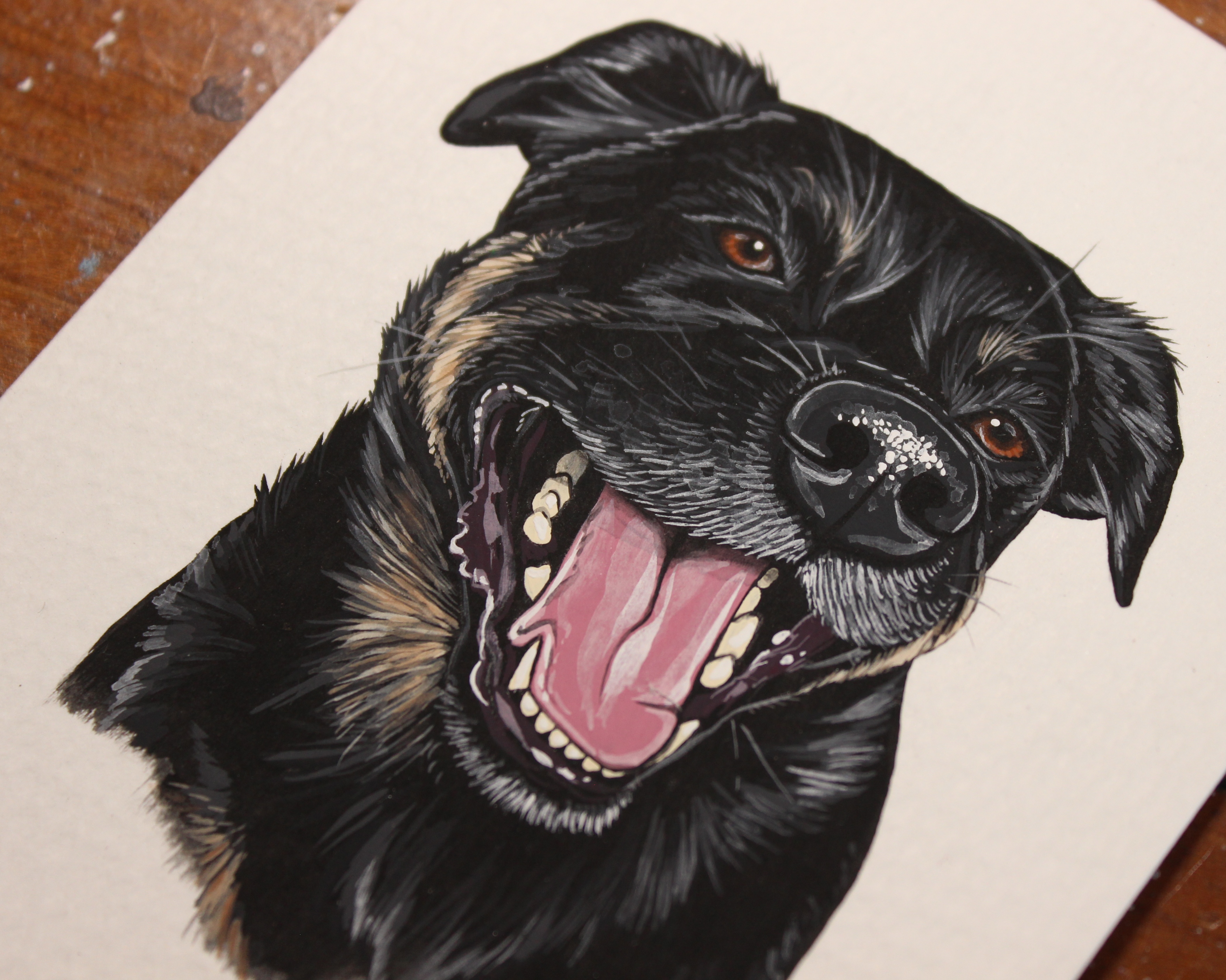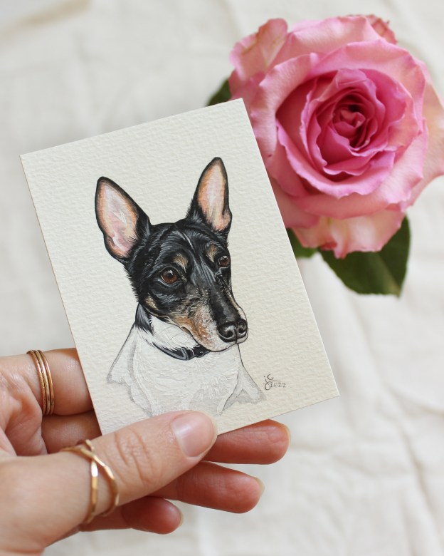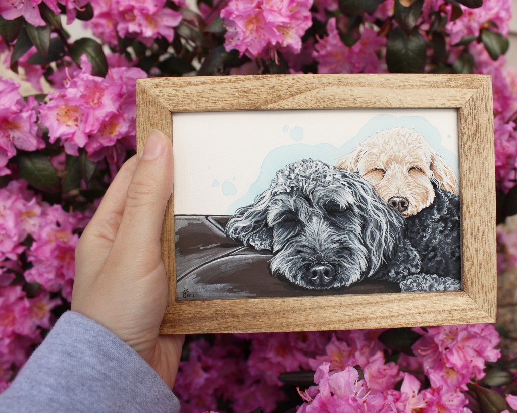 I seem to have gotten into a pretty good work flow recently painting my pet portraits. I’m able to sit down and either finish one portrait per day (if they’re a small size), or one portrait every other day (if they’re a bigger size, or a double portrait).