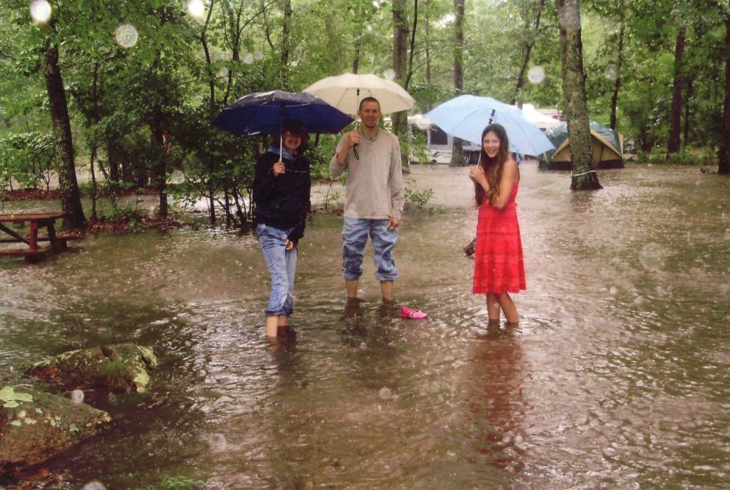 Taylor, Dad, and me in the flashflood at Burlingame campground, 2009. Our tent was like a waterbed, and other campers were kayaking around their sites