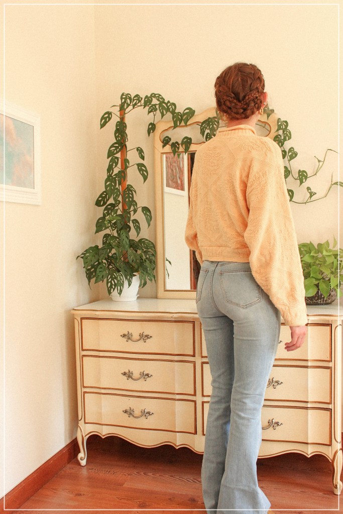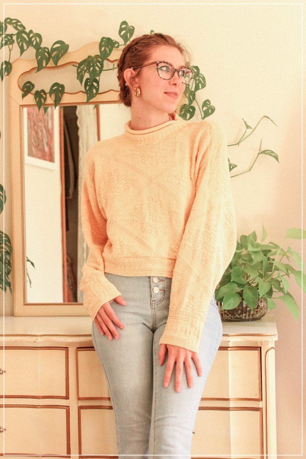It’s a tale as old as time: I saw her at the thrift shop and I fell in love with the buttery yellow, 100% cotton yarn. Aside from her awkward length (and one loose thread in the cuff that I easily mended), she was perfect. So I bought her, cause I knew I’d just figure something out later to fix her up.
