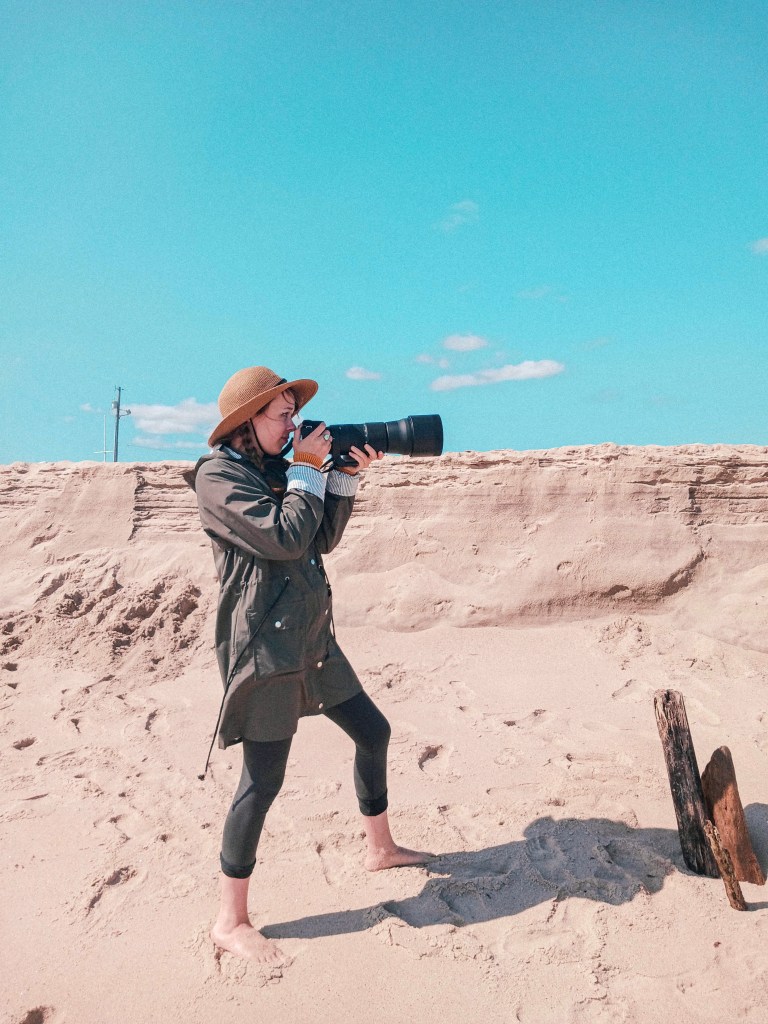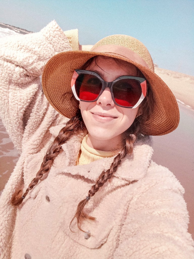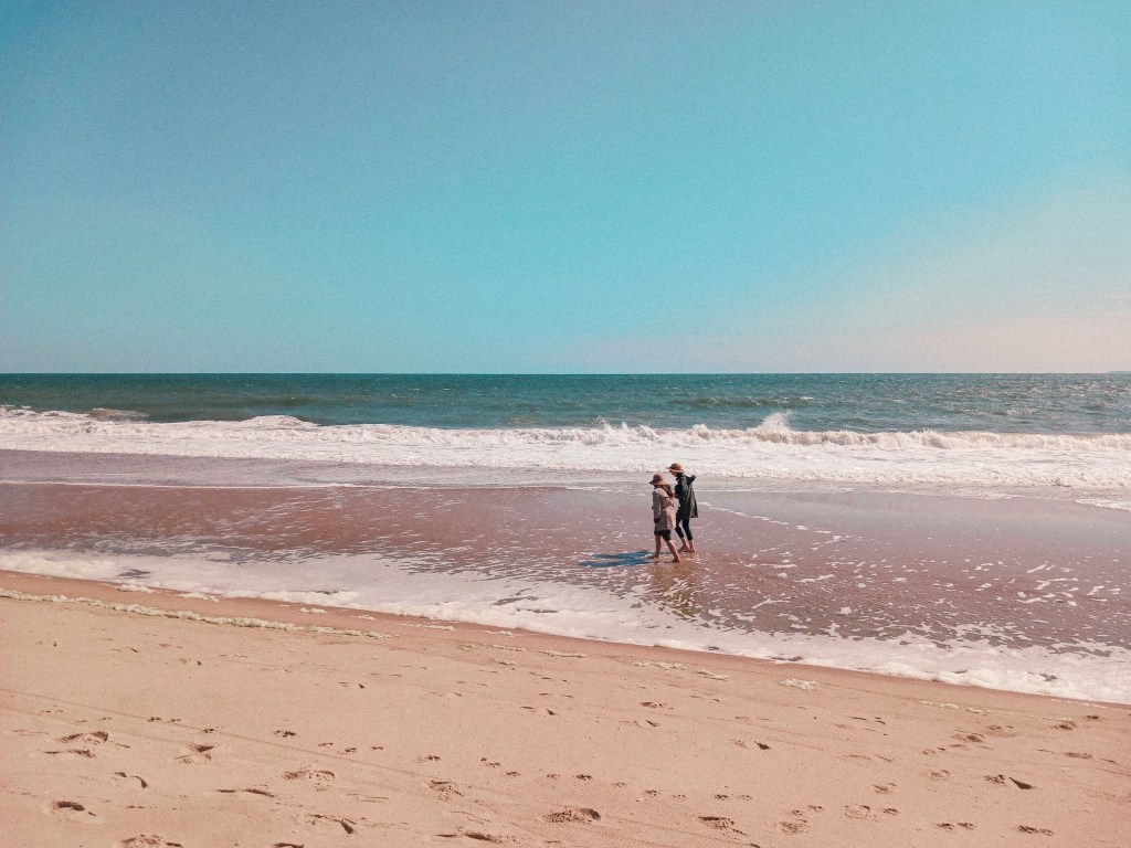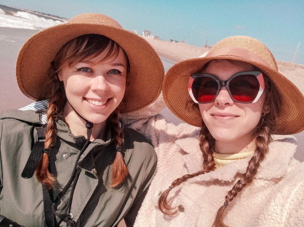 Sandbars, and rivers of swift-moving, salty water separated the beach from the ocean, and certain waves crashing in opposite directions kept creating these squares of moving water on the sand. I can only assume that the swimming conditions would have been treacherous — we didn’t do anything more than walk ankle-deep in the slower moving water, although a few waves did catch us off guard and got us quite damp (and my hat did fly off right into the water once…or maybe twice. Hence the hat grab in every photo).