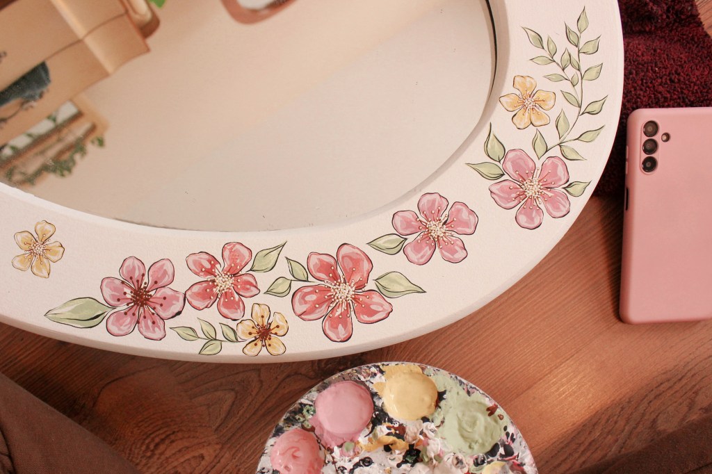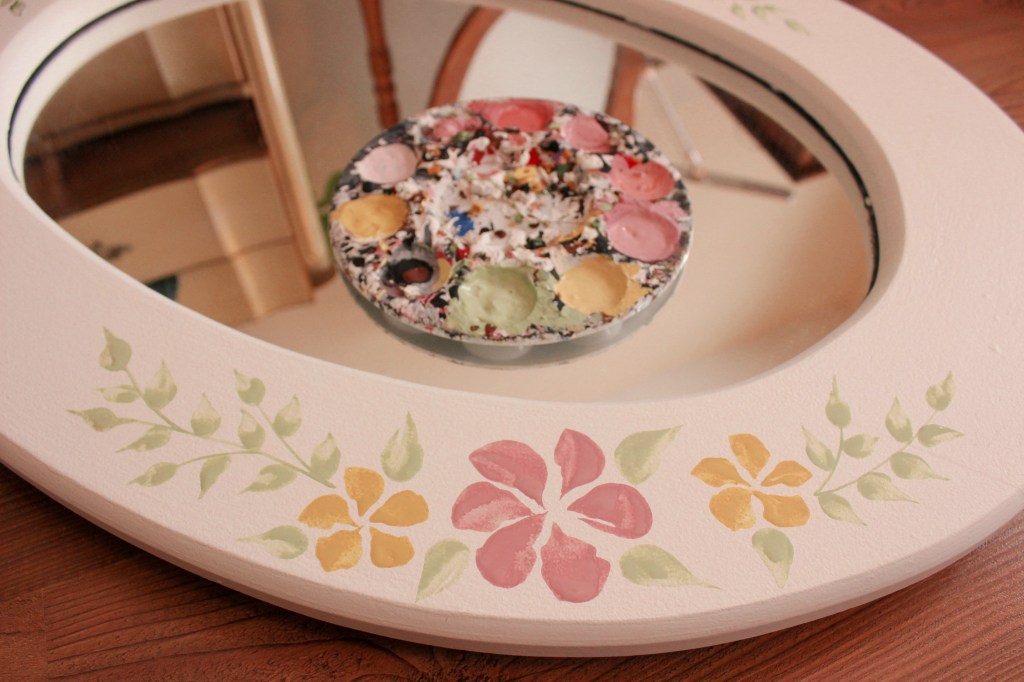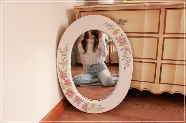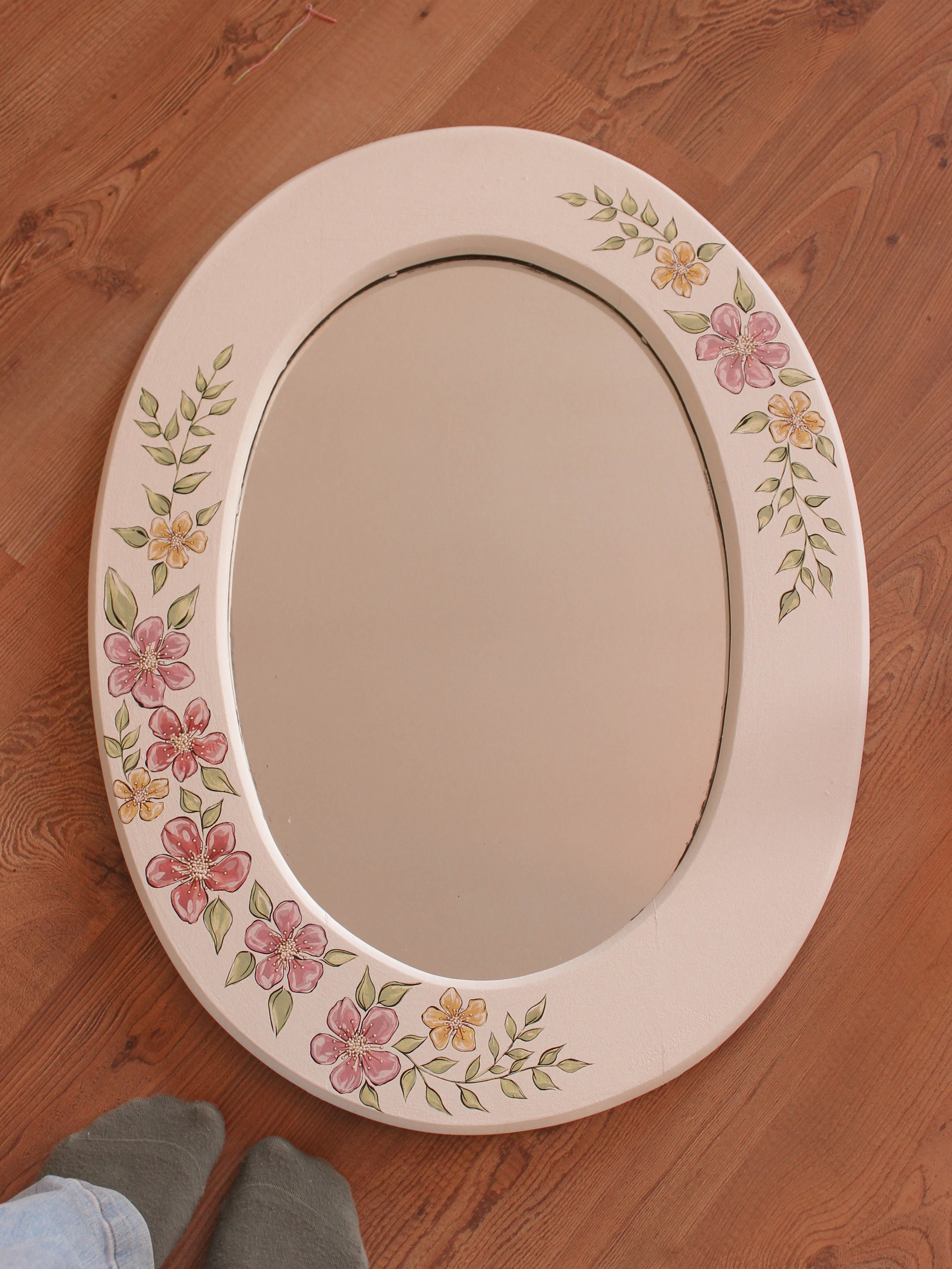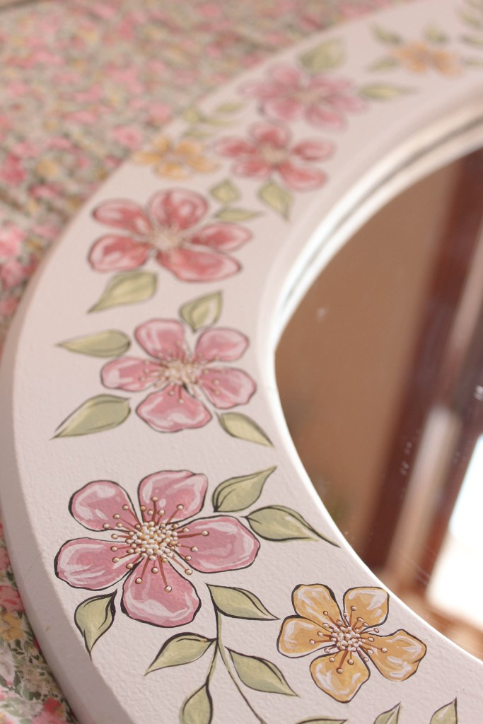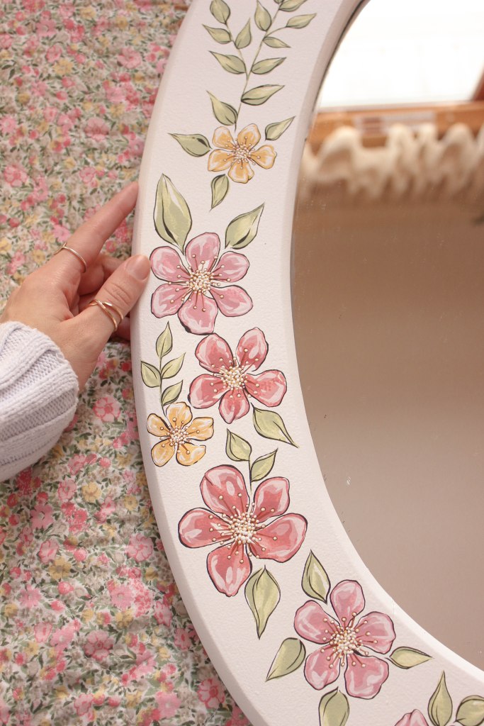 One night recently, when my inspiration and creativity started to return, I just pulled out this mirror and stared at it. And I didn’t think too deeply about it — about the colors, and the placement of the flowers and leaves — I just found my favorite paints (always the pinks and yellows), and started working.