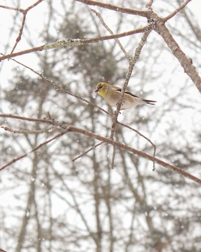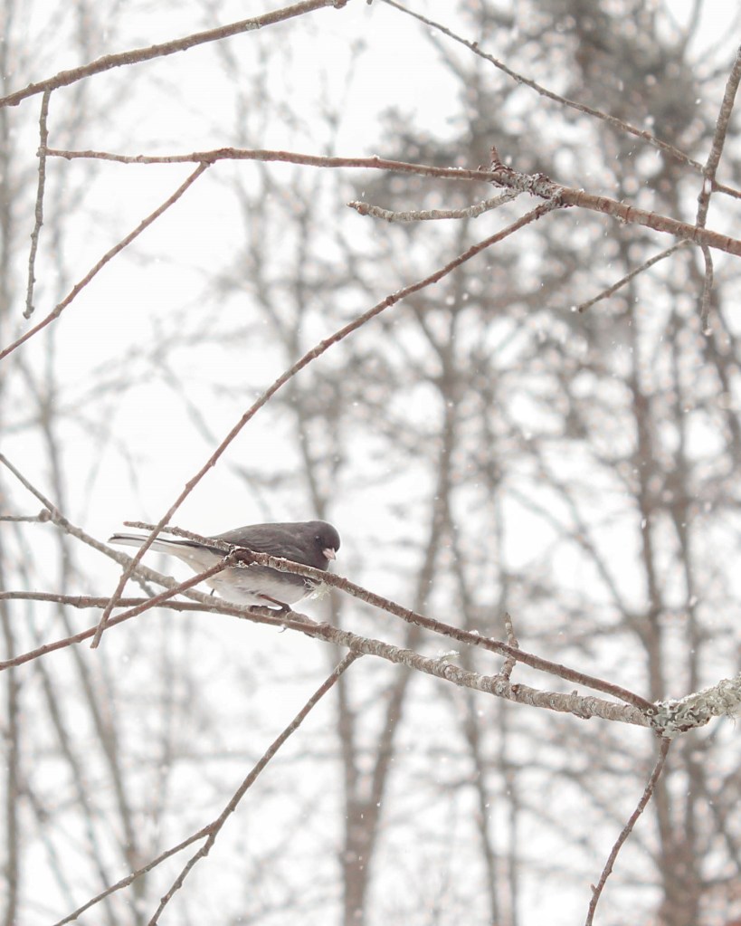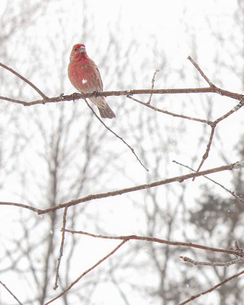 Riley Mae tied some branches onto the bird feeder by the kitchen window; she set it up for photo opportunities, and it works perfectly because the birds will even come to the feeder while I’m sitting on the glider just a couple feet away from it. This is a little dark-eyed junco (left) and a house finch (right) a.k.a a Hollywood Finch