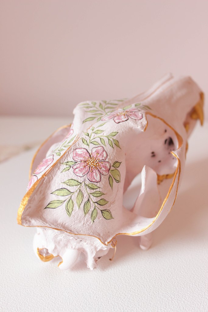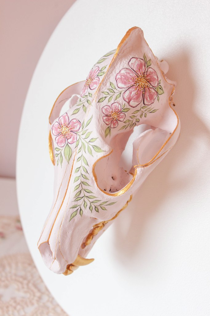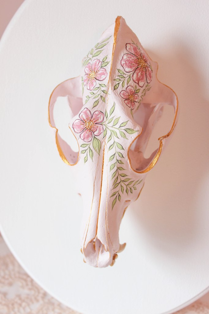 I briefly considered changing the color of the flowers, but ultimately decided that I wanted my coyote to match my previously-painted doe skull, since I knew that they’d be hanging right next to each other.