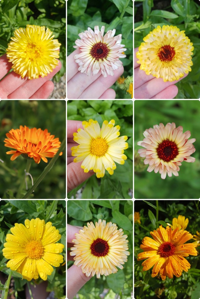 Every year I notice more and more that the calendulas are cross-pollinating with each other and giving me more colors and variations. This year I have the most diversity yet, with deep yellows, buttery yellows, bright oranges, burnt oranges, peachy oranges, and even a pale pinkish hue.