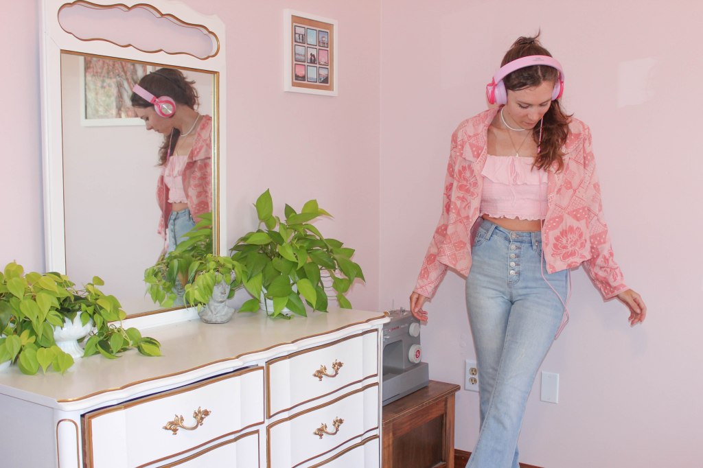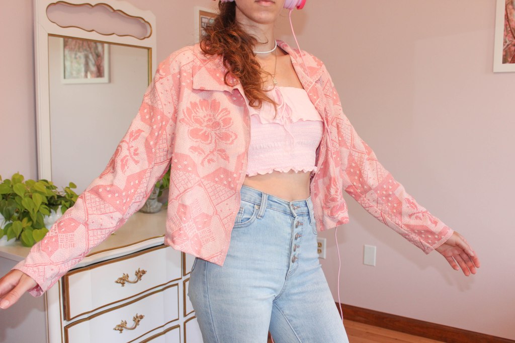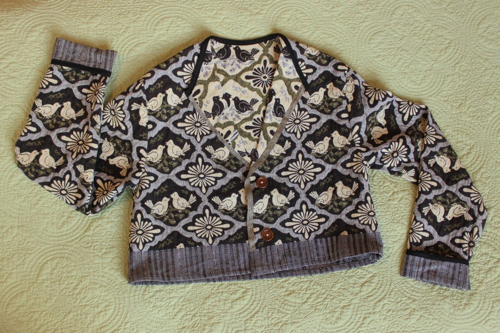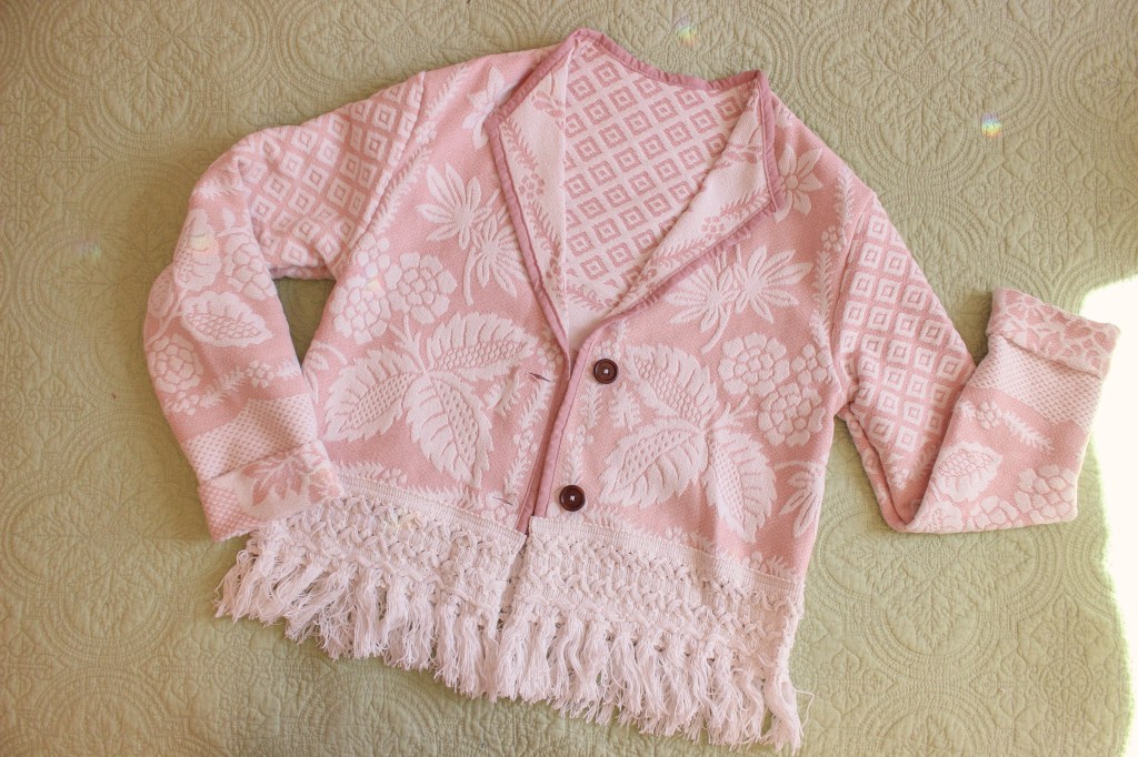 this Upcycled Pink Cardigan is made out of a vintage cotton bedspread — I love this fabric!