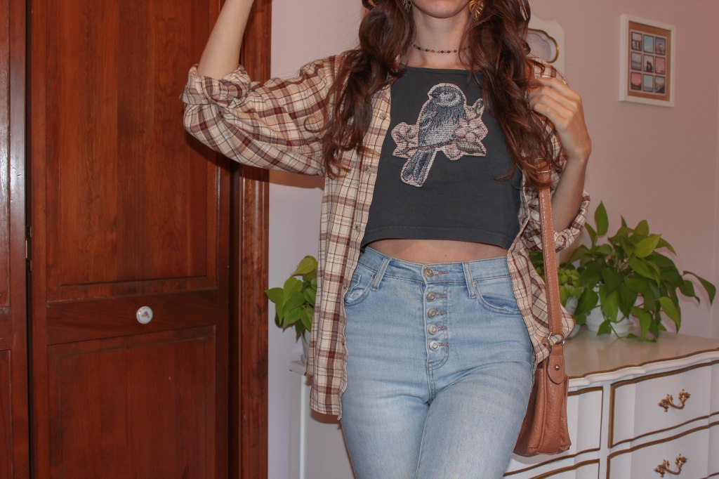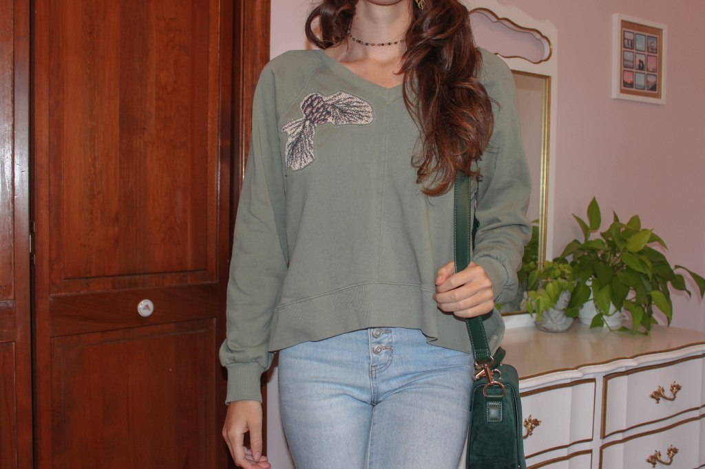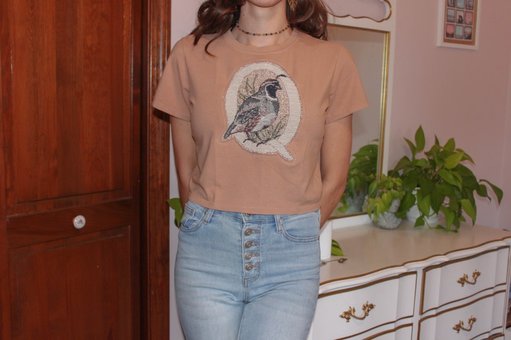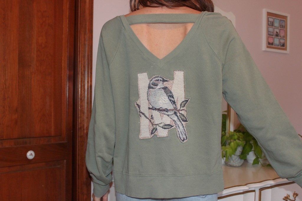 M for Northern Mockingbird. I bought a vintage bird alphabet blanket a year or two ago and have been saving it for something special. I recently got it out and started to create some upcycled pieces with thrifted tops! I put together a video of me making one for myself that you can watch here!