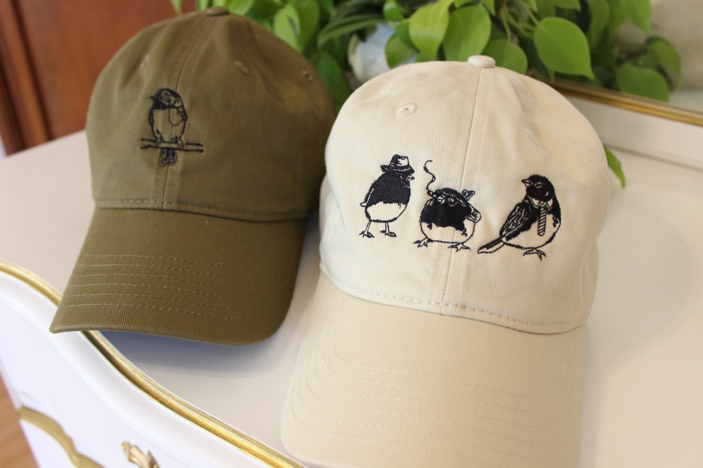 The baseball caps are organic cotton and the fabric is super high quality (we were all surprised and impressed when our testers arrived!). We weren’t sure how the embroidery was going to turn out, since my bird graphics where quite detailed, but they came out really well, and Dad wears his cap almost every day now!